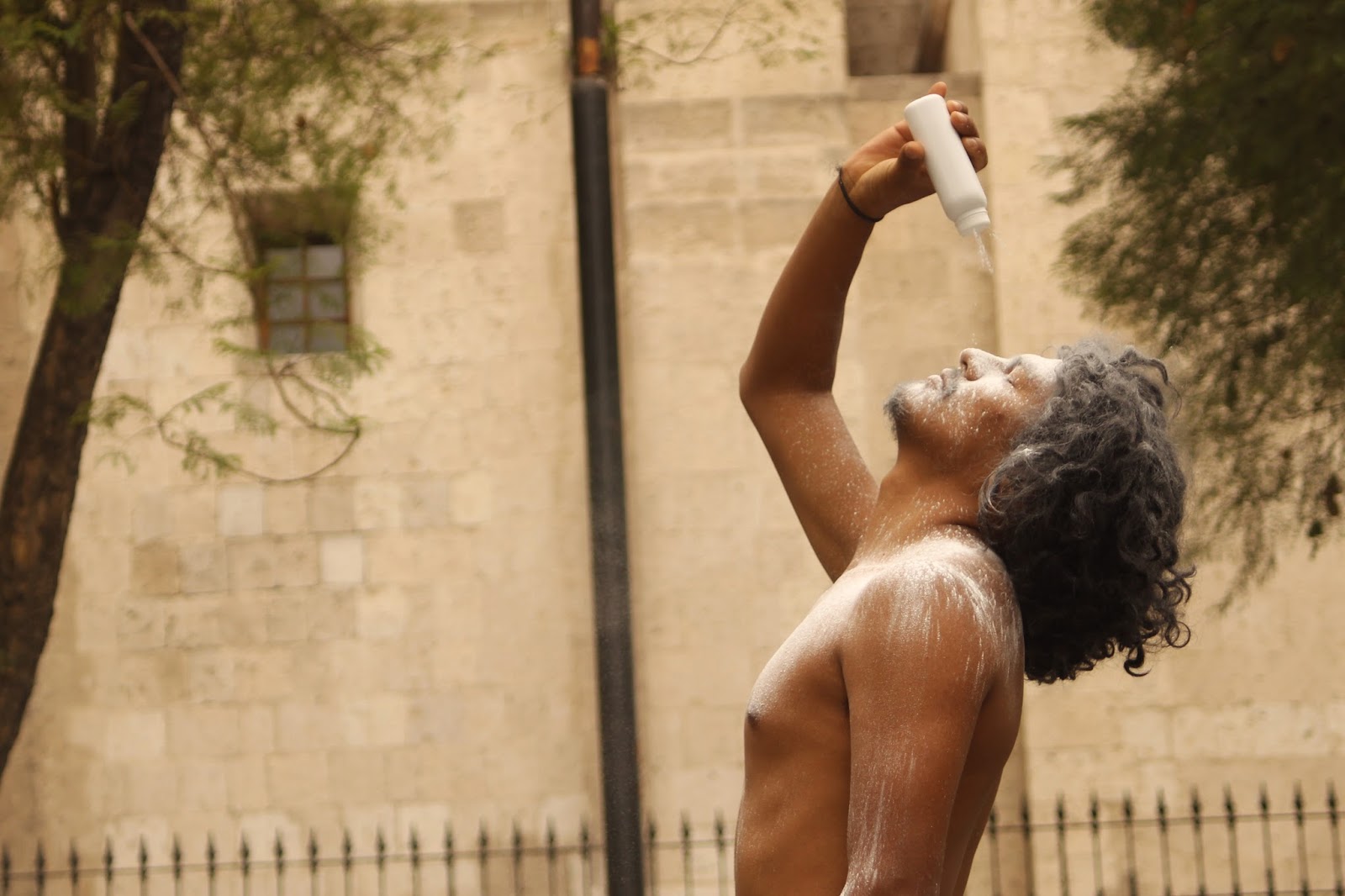 La segunda acción consta de la muestra de sustancias blancas símbolo de lo puro (sal y talco) que son desmitificadas al esparcir sal al piso y sobre el cuerpo (símbolo de mal augurio) y blanquearse el cuerpo desnudo con talco (símbolos de inconformidad) frente a templos sagrados, infringiendo los espacios del espectador e invitándolo a reflexionar sobre la estética propuesta y las acciones abiertas a libre conceptualización.