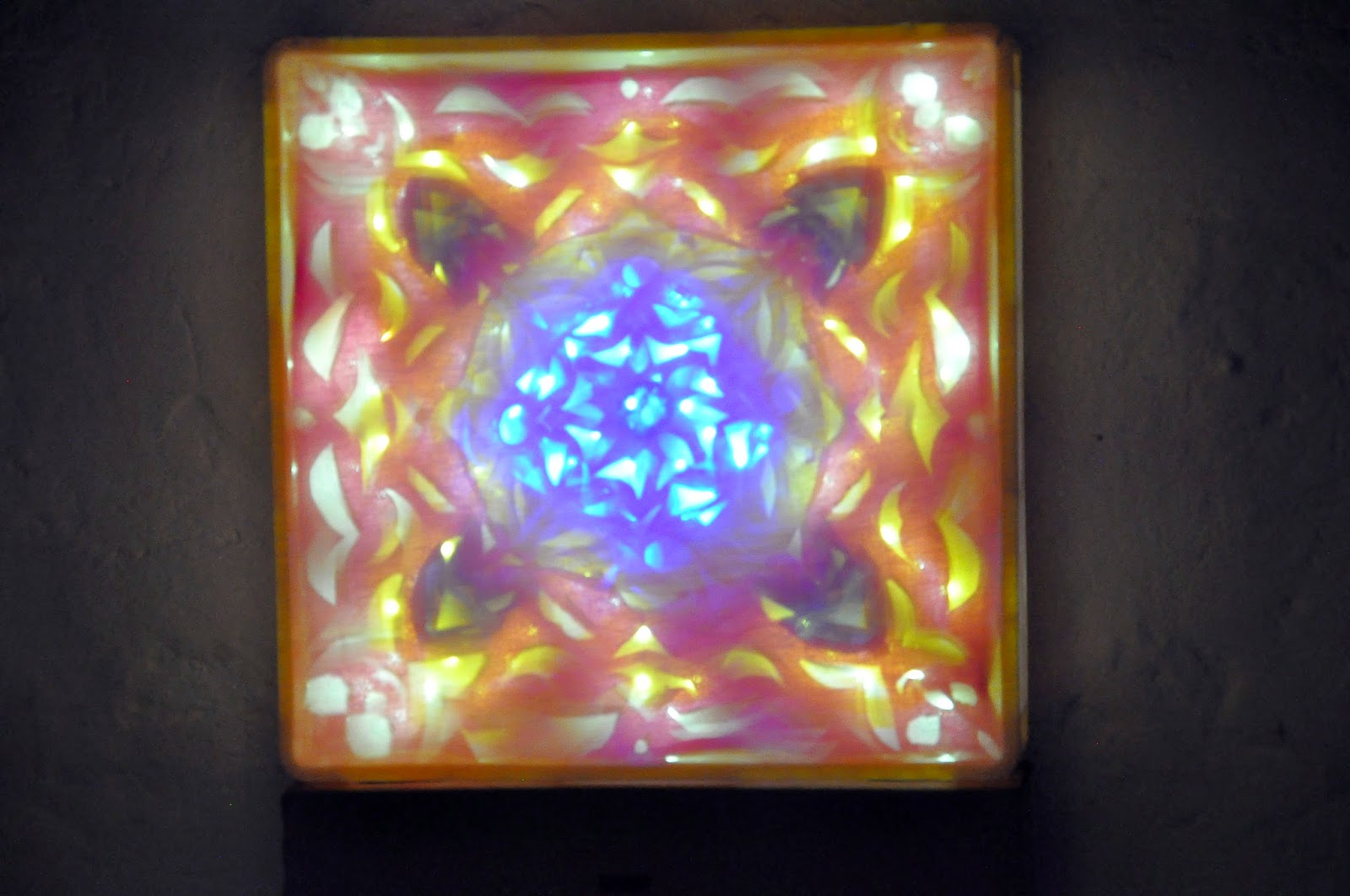 focos de luz compuestos por ciento veinte leds blancos o azules, los que cumplen la función de proyectar luz desde el fondo, siendo interrumpidos por papeles calados que definen formas y colores con el fin de generar múltiples sombras que se proyectan sobre una superficie semi-translúcida cumpliendo en el frontis la función de pantalla, logrando así una sugestiva sensación de profundidad y volumen.