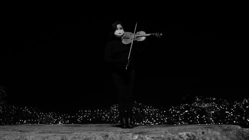 Doris Quispe, violinista e integrante de la Orquesta Sinfónica del Cusco, interpreta un yaraví (pieza musical tradicional-mestiza de carácter melancólico) en la huaca -lugar sagrado- Mesa Redonda durante la pandemia.