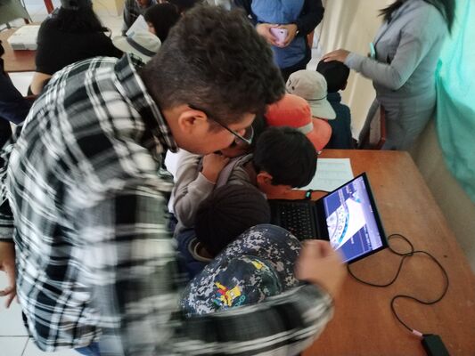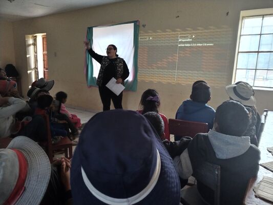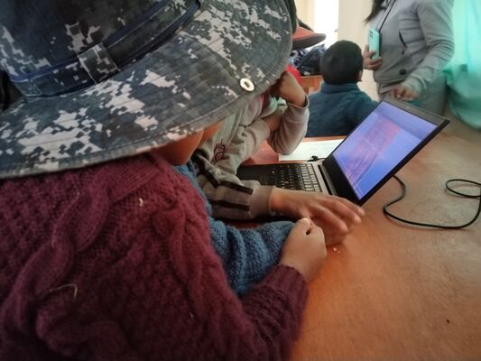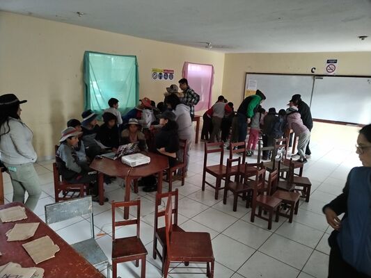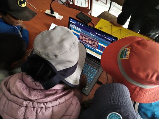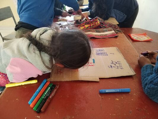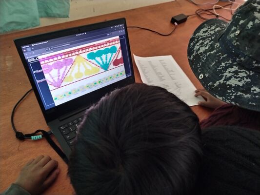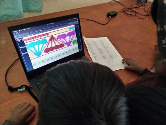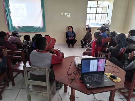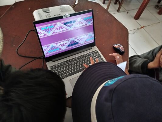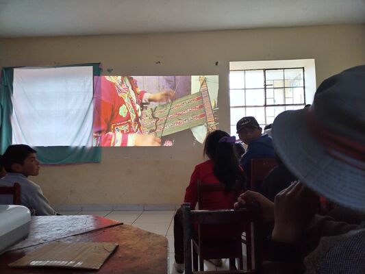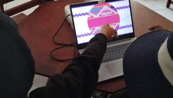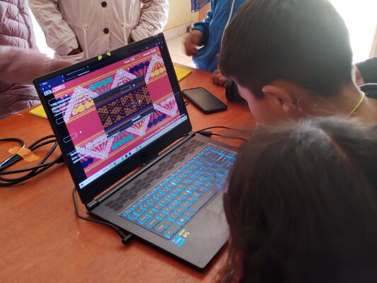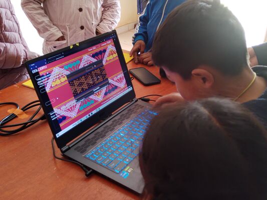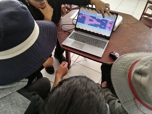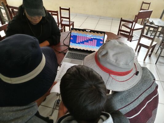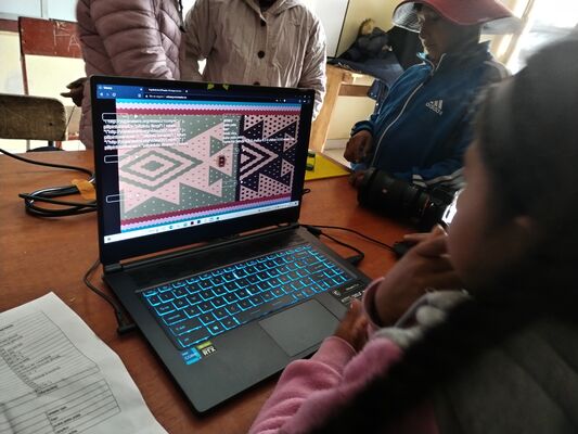 Presentación de ##Yup4n4S1m1, proyecto de código aplicado al audiovisual con sintaxis basado en la lengua quechua, trabajado con artesanas de la comunidad de Acopía, desarrollado en la Biblioteca Chico Latino del distrito de Acopia, Acomayo, Cusco.. El espacio fue co-facilitado por Jessica Rodriguez, Luis Navarro, Jesed Mateo, Fabrizio Dávila y Nath.